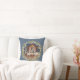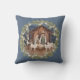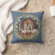 Deze traditionele kerstkussen voorzien van een nationaal afbeelding van baby Jezus die in een boosheid met Mary en Joseph in het midden slaapt. De nativiteit wordt omringd door een groef met witte bessen. De achtergrond heeft een coördinerende blauwe kleur.