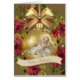 Een mooi traditioneel oogstbeeld van de Baby Jezus in een woede op een gouden kerstsieraad met een mooie kerstflorale kreet. De banner leest: "Venite Adoremus" om ons hem te laten aanbidden. Alle tekst en doopvonten kunnen worden gewijzigd.