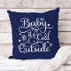 Seizoensgebonden kussen zijn voorzien van een stijlvol script "Baby het is Koud Buiten"-typografie met ster- en sneeuwvlokaccenten. De blauwe achtergrondkleur van de zeemacht kan worden aangepast om met uw vakantiedagen te coördineren.