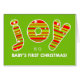 Vertel je familie en vrienden dat dit je baby's eerste Kerstmis zal zijn met deze prachtige annoncementkaart. Een kleurrijk ontwerp met het woord JOY zeer groot en versierd met groene en rode strepen en witte sterren. Goed nieuws maakt deze vakantie nog meer bijzonder.