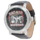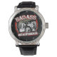 This wall clock features a bold, edgy design for a confident truck driver. Against a black background with a red rim and abstract red wing-like graphics, it showcases a distressed illustration of a semi-truck. The prominent text "BADASS MOTHERTRUCKER" is displayed in a rugged, distressed white and red font, making a strong and audacious statement about the driver's persona.