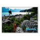 Een digitaal schilderij van een kale adelaar, geperst op een driftwood log, aangespoeld op de steenrijke kust van Alaska; bergen liggen op afstand. Er verschijnt ook een tekst met de tekst "Alaska".