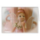Een fotografische fijne kunstkaart van een roze ballerina-beeldje. Ze is omringd door roze vassen met een zachte achtergrond in wit.