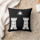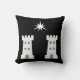 "Sable, twee torens en in het hoofd een mul van drie grotere en zes mindere punten argent." Populaire badge voor de Baronie van Stargate in de Society for Creative Anachronism. Achterkant van kussen is een patroon in middeleeuwse stijl in coördinerende kleuren.
