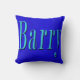 Op dit lelijke kussen op een blauwe mozaïekachtergrond staat een blauwe Barry-naam logo.