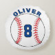 Honkbal Bunting Flags Kids Verjaardag Ronde Kussen. Het ontwerp heeft honkbal- en bunting-vlaggen in rode, witte en blauwe kleuren. Voeg jouw naam en leeftijd toe.