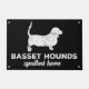 Basset Hounds hier gespoeld, schattig Basset Hound silhouette afbeelding en tekst in noodlijdende krijstijl op een zwarte achtergrond.