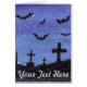 Een klein waterverf landschap van vleermuizen die 's nachts over een begraafplaats vliegen.