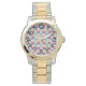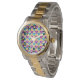 Dit dameshorloge heeft een Bauhaus-ontwerp van herhalende driehoeken in goud, turquoise, blauwgroen, paarse en lichtgoud. Als je het ontwerp leuk vindt, maar liever verschillende kleuren hebt, stuur me dan een bericht.