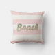 Grote cabana strepen in bord roze met Strand kunst tekst afbeelding. Een bekend kusttafereel van zand, zee en kleine zeevogels die langs de oceaanrand slenteren.