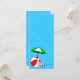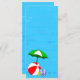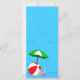 Vun strand of zwembad, de kunst van een rood strandbal, groene zonneparaplu, vakantie-sandalen en zontaanolie op een waterige blauwe achtergrond met krulgolven.