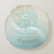 Deze ronde werpt kussen in de zachte kleuren van zee en zand staat u toe om uw eigen naam en tekst gemakkelijk toe te voegen gebruikend de verstrekte sjabloon. Het eenvoudige afbeelding van palmbomen op een noodlijdende, waterverf achtergrond wordt benadrukt door een golfaccent in water en wit. Zoek ID623 om te zien coördinerend seuit elementen en extra producten met dit ontwerp.
