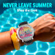 This round wall clock embodies a relaxed, tropical theme with a vibrant, striped sunset background in shades of orange, yellow, pink, and blue. Silhouetted palm trees, a beach umbrella, and a lounge chair complete the serene island scene. The words "Beach Vibes" are prominently displayed in a playful font, making this clock a perfect addition for beach lovers or anyone seeking a summery ambiance.