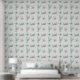 Kustpastelblauwe, rode en lichtgroene kreeft, krab, zanddollar en zeester strandachtige tropische stok en schil wandpapier.