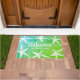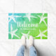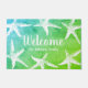 Beachy doormat met witte zeester, witte manuscript "welkome" tekst, oceaangroene/blauwe gradiëntachtergrond, en de naam van uw familie in wit manuscript!