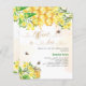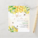 Een stijlvolle witte en gouden waterkleurige achtergrond. Versierd met hommels, smeltende honing, een honingraat met gele bloemen, bloemen en een honingpot. Met de tekst: bedoeld om te worden geschreven met een modern handgeschreven stijlscript met harten. Personaliseer en voeg de naam van de bruid toe. 1 vel = 1 uitnodiging afgedrukt rand tot rand.