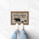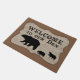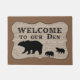 Dit is een schattige deurmat die perfect is voor een hut of een bos thuis. Hij heeft een faux-houtkorrelbanner met een zwart beer en twee cubs. De tekst boven de afbeeldingen van het beer luidt "Welkom in onze Den Haag". De banner wordt geplaatst op een stevige middelgrote bruine achtergrond.
