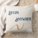 Modern minimalist throw pillow with "Begin anywhere" quote in sophisticated navy on warm cream background with terracotta geometric accent. Perfect motivational decor for home offices, living rooms, or bedrooms. Ideal gift for graduates, entrepreneurs, or anyone starting a new journey. Clean Scandinavian-inspired design complements contemporary and bohemian interiors beautifully.