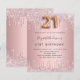 Een moderne, stijlvolle en glamoureuze uitnodiging voor een 21ste verjaardagsfeestje. Een stoffige roos, roze metalen achtergrond met faux glitter drip, verfdruppelaar. De naam wordt geschreven met een modern donkergrijs gekleurd handgeschreven stijlmanuscript met letters. Pas je partijgegevens aan en voeg deze toe. Nummer 21 wordt geschreven met een ballonstijllettertype, script.