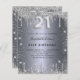 Een moderne, stijlvolle en glamoureuze uitnodiging voor een 21ste verjaardagsfeestje. Een faux zilveren achtergrond, versierd met glitterstof. Personaliseer en voeg jouw naam en partijdetails toe. Nummer 21 wordt geschreven met een ballonstijllettertype, script.