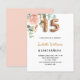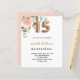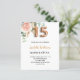 Een elegante uitnodiging voor een Quinceañera, 15de verjaardag. Een witte achtergrond. Gedecorbeerd met een roos goudkleurige en lichtroze waterkleurige rozen bloem, groene eucalyptusbladeren, sprigs, groen en nepgoudsprigs. Personaliseer en de naam en partijdetails. Zwarte en gouden letters. De naam wordt geschreven met een modern handgeschreven stijlmanuscript met letters. Nummer 15 wordt geschreven met een gouden ballonstijllettertype. Achterzijde: roos gouden achtergrondkleur.
