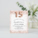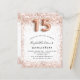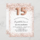 Voor een elegant Quinceañera, 15e verjaardag. Een witte achtergrond. Verkleurd met roos goud, roze faux glitter, sparkles. Pas een naam, en partijdetails aan en voeg deze toe. De naam wordt geschreven met een handgeschreven stijlmanuscript, aantal 15 met de doopvonten van de ballonstijl.