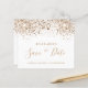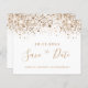 Een meisje en trendy Save the Date Card for a Quinceañera, 15e verjaardagsfeest. Een stijlvolle witte achtergrond met faux goudglitter stof. Pas een datum en een naam en een tekst aan en voeg deze toe. Gulden gekleurde letters. De tekst: Sparen de Datum wordt geschreven met een groot trendy hand lettered stijlmanuscript.