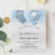 Voor een elegante 21ste (of om het even welke leeftijd) verjaardag. Een faux zilveren metalen achtergrond. Gedecorreerd met lichtblauwe faux glitterdruppels, verfdruppelende blik en blauwe ballonnen. Pas een naam, leeftijd 21 jaar en partijdetails aan en voeg deze toe. De naam wordt geschreven met een handgeschreven stijlmanuscript met letters.