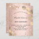 Een blote gouden achtergrond van roos met eucalyptusgroen en faux glitter stof. Personaliseer en een naam en partijdetails. Zwarte gekleurde letters.