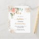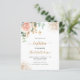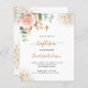 Een witte achtergrond versierd met eucalyptusgroen, een roos gouden en wazige roze roze roos, en gouden bladeren en faux gouden glittervallen. Geef de naam en de ceremoniegegevens van het kind een persoonlijk tintje. Zwarte en gouden gekleurde letters. Achterzijde: witte achtergrond met gouden faux druppels