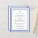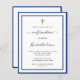 Een moderne, elegante en bevestigingsuitnodiging. Een witte achtergrond, versierd met koningsblauwe lijsten en een gouden kruis. Pas een naam en details aan en voeg deze toe. Zwarte gekleurde letters.