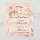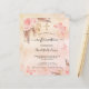 Een roos gouden, wazige roze roze faux metallische achtergrond. Gedecormeerd met roos goud en roze floralen, rozen, pamapgras, vlinders en een gouden kruis. Pas een naam en de details aan en voeg deze toe.