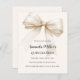 Een zacht beige, crèmekleurige achtergrond, versierd met een grote boog. Personaliseer en voeg een naam en partijgegevens toe. 1 vel = 1 uitnodiging bedrukt rand tot rand.
