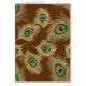 Notitiekaart in een tekening van paukveren, versterkt en gesmolten in een zacht contekrayon-effect - zacht gouden beige en beige veer, met roest, kobalt blauw en smaragdgroen oog, op een chocoladebruin