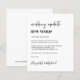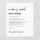 Een budgetvriendelijke minimale moderne huwelijkswijziging van de locatieaankondiging met een "nieuwe trouwlocatie", geschreven in een mix van een hedendaags script en een gewaagde trendy typografie (u kunt dit aanpassen aan "nieuwe datum", "kleinere bruiloft", enz.). Pas uw verandering van planbericht aan, voeg uw namen in een handtekeningsachtig manuscript toe en voeg uw trouwwebsite op de achterkant toe of verlaat leeg.
