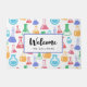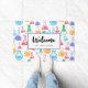 Een welkome deurmat met een leuk en kleurrijk patroon. Onderzoekswetenschapper vibe met bekers en flessen van verschillende vormen en maten in heldere gelukkige kleuren.