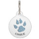 Blauwe glitterpootdruk met de naam van de hond op voorzijde met witte achtergrond, op de achterzijde Rode waakzame achtergrond met witte tekst die Onverwachte OH zegt! Bel mijn moeder, ze huilt lelijk. De rode achtergrond roept aandacht aan het label voor iemand die de hond vindt om ervoor te zorgen om het alarm te zien.