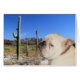 Een fotografisch afbeelding van een witte Engelse bulldog is te zien in het midden van indrukwekkende saguaro cacti in de Sonoran woestijn.
