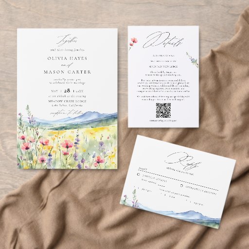 Rustic Meadow Wildflowers Wedding Invitation legt prachtig de essentie vast van een romantische, outdoor bruiloft met zijn serene waterverf bergketen in de verte en een weelderige weide vol met bloeiende wilde bloemen. Met zachte tinten van saliegroen, stoffig blauw en goudgeel roept dit ontwerp de vredige schoonheid van de natuur op. De rustieke charme van de wilde bloemen creëer is een natuurlijke, aardse sfeer, ideaal voor een bruiloft in de bergen of in de buitenlucht. Ideaal voor koppels die van het buitenleven houden, deze op natuur geïnspireerde uitnodiging combineert rustieke elegantie met de adembenemende schoonheid van een weideomgeving en zet de perfecte toon voor uw speciale dag.