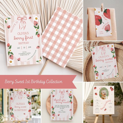 Celebrate your little one’s milestone with this adorable “Berry First” birthday invitation, perfect for a 1st birthday party! Featuring charming strawberries, delicate white daisies, and soft pink stripes, this sweet and playful design creates the perfect setting for a strawberry-themed celebration. Easily personalize with your party details to create a beautiful invite that matches your Berry Sweet collection and makes your baby’s first birthday extra special.