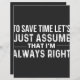 om tijd te besparen , kun je altijd goed overnemen , tijd besparen , maar je kunt gewoon aannemen dat je altijd gelijk hebt , humor grap , sarcasme , toekomstige bankmanager , gepensioneerde bankmanager , bankmanagers , i love economics , afstuderen , inspiratie voor thuisbankmanager is een huispolitieagent , im en , om tijd te besparen , veronderstel dat hij nooit verkeerd is , ga ervan uit , bespaar tijd , eens op tijd