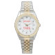 Chique en veelzijdig, dit gepersonaliseerde tweekleurige dameshorloge combineert zilveren en gouden tinten voor tijdloze elegantie. Pas het aan met namen, initialen of uw eigen bericht om een horloge te creëer dat uniek van u is of het perfecte cadeau.
