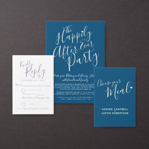 Typografisch manuscript moderne eenvoudige witte tekst op donkerblauw van de zeemansachtergrond het ontwerp na de bruiloft uitnodigt leest beter laat dan nooit trouwpartij. Eenvoudig modern hedendaags ontwerp, dat u aanpast met uw eigen trouwfeest na de partij, bruiden- en groomnamen en antwoordgegevens op de voorkant en uw favoriete trouwfoto vanaf uw trouwdag aan de achterkant. Overeenkomende trouwproducten en andere kleurenopties beschikbaar in de winkel. © Design by Sarah Trett voor www.mylittleedenweddings.com