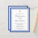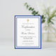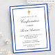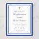 Een moderne, elegante en bevestigingsuitnodiging. Een witte achtergrond versierd met koninklijk blauwe lijsten en een gouden kruis. Personaliseer en voeg een naam en details toe. Zwarte gekleurde letters, elegante handgeschreven stijl script.