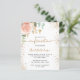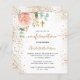 Een witte achtergrond versierd met eucalyptusgroen, een roos gouden en wazige roze roze roos, en gouden bladeren en faux gouden glittervallen. Personaliseer en een naam en ceremoniedetails. Zwarte en gouden gekleurde letters. Achterzijde: witte achtergrond met gouden faux druppels