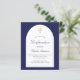 Een marineachtergrond en een witte boogvormig lijst. Personaliseer en een naam en ceremoniedetails. Elegant hand lettered stijlmanuscript. Achterzijde: blauwe achtergrond voor de marine.