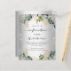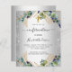 Een faux zilverachtige achtergrond met eucalyptusgroen en gouden bladeren en faux zilverglittersparken. Een gouden kruis. Personaliseer en een naam en ceremoniedetails.