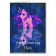 Schattige, een kawaii-stijl eenhoorn in schaduwen van roze en paarse tribunes die in een golvende pool van water worden weerspiegeld.