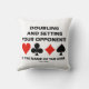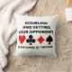 Brugspelers die weten waar het spel van brug / dubbele brug over gaat, zullen genieten van dit werpkussen met de vier kaartpakken samen met de volgende uitleg van het spel van de brug: "Verdubbelen en instellen van je tegenstanders is de naam van het spel". Laat anderen een dubbelslag maken met je uitleg over waar het brugspel om draait met dit tongue-in-cheek humor werpkussen!