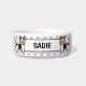 Destei's originele cartoon illustratie van een schattige Biewer Terrier/Biewer Yorkshire Terrier-hond. De achtergrond heeft een patroon van grijze hondenpootafdrukken en er is ook een aanpasbaar tekstgebied voor de naam van de hond.